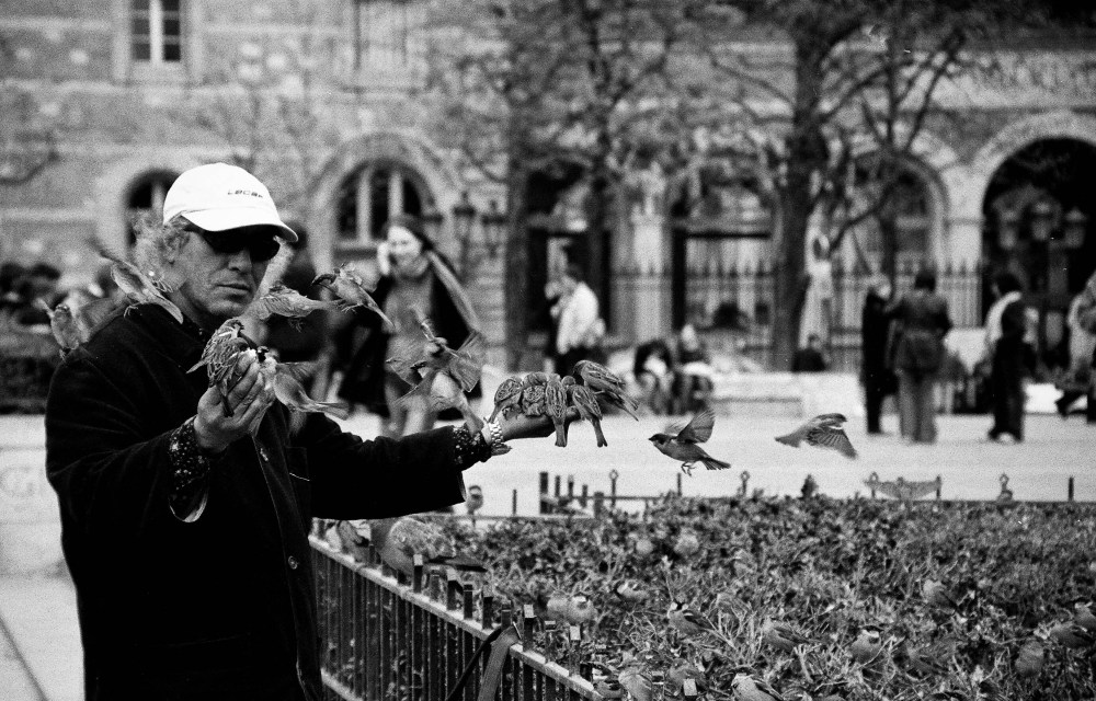 Notre Dame, Paris, France, 2004: The Sparrowman of Notre Dame was quite popular with the birds… And no, he wasn’t covered in bread crumbs. Notre Dame means “our lady” in French and is commonly used in the names of Catholic churches in French speaking countries. Canon EOS 1N