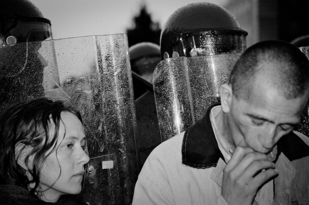 Dublin, Ireland, 2004: During the demonstrations of Mayday 2004 (see previous) I caught this image of a rather defiant couple. They acted completely oblivious to what was going on behind their backs… 10 minutes later the police charged- I got away but very much doubt they did… Canon EOS5/28-105/Tri-X