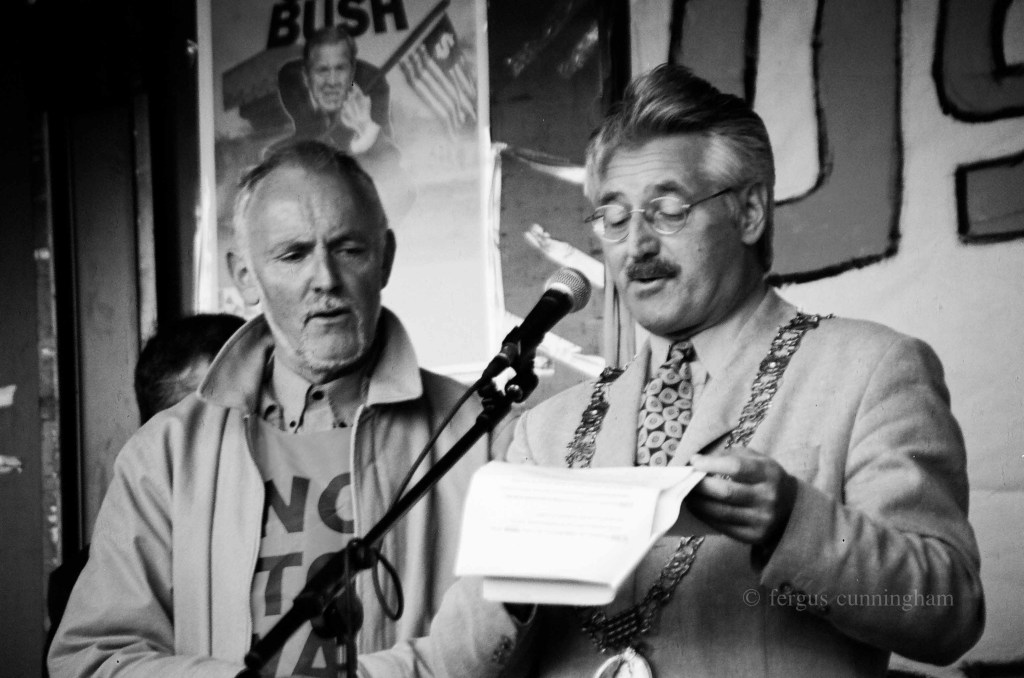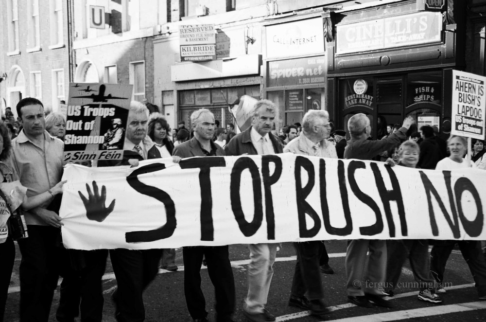 Dublin, Ireland, 2004: At an Anti-Bush rally in Dublin, anger and frustration was very evident across a broad section of Irish society, with Bush’s upcoming visit and the EU-US summit at Dromoland Castle. A lot of criticism was directed at the Irish government for allowing the US access to Shannon airport for the refueling of US bombers, and the transit of “extraordinary renditioned” Al Qaeda” suspects to Guantanamo Bay.